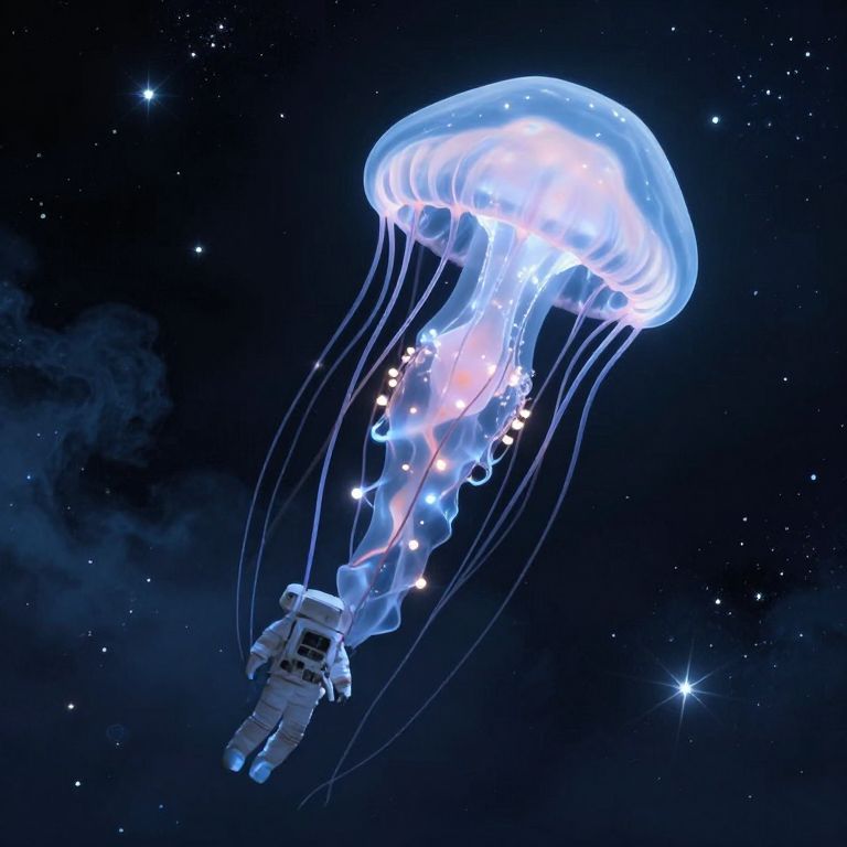 Digital artwork of an astronaut floating beneath a glowing, translucent jellyfish in a starry, dark blue space background.