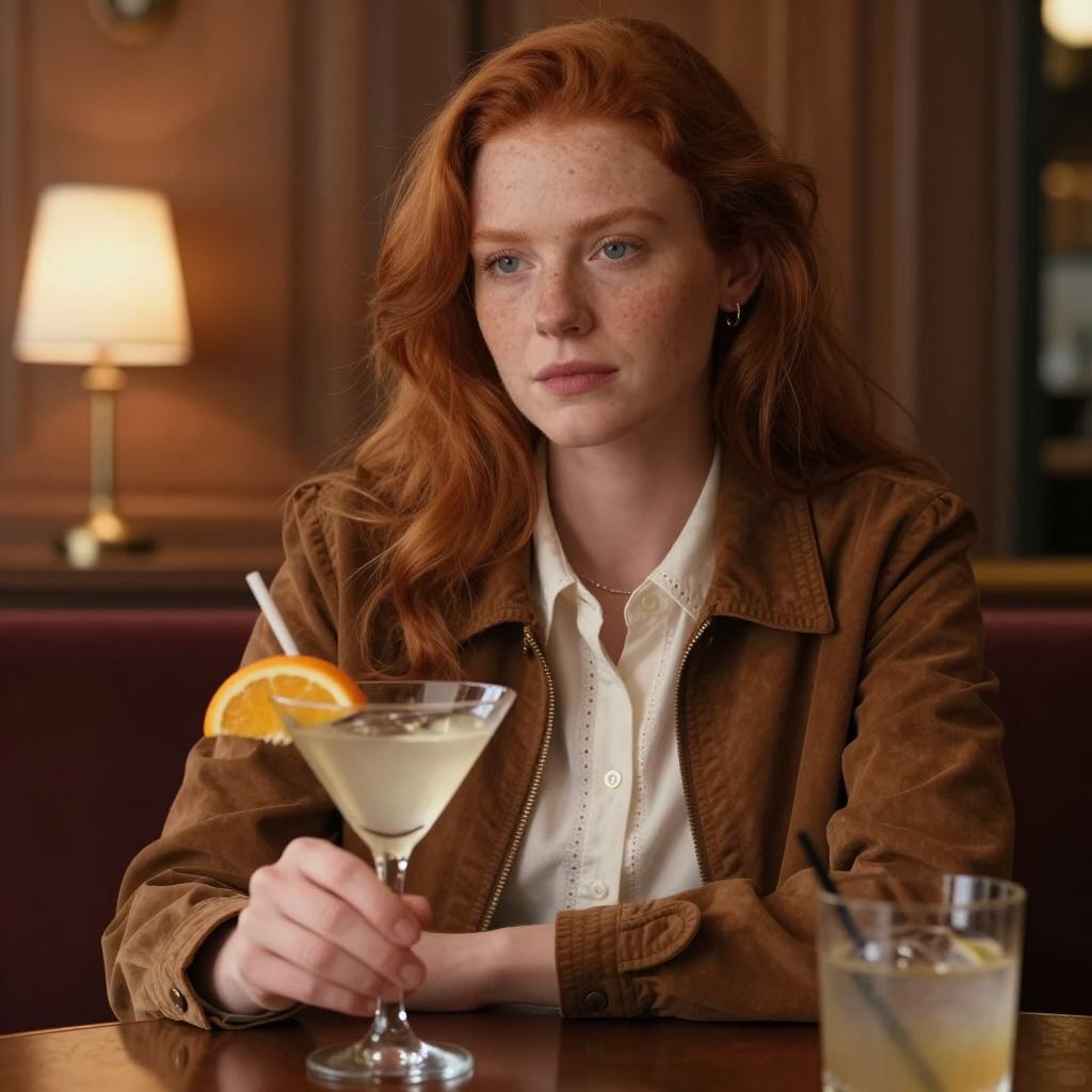 Red-haired woman with fair skin and light freckles, wearing a brown jacket over a white lace-trimmed shirt, sits at a dimly lit table. A hand holds a martini glass with orange slice and straw in the foreground. Warm wooden background with a glowing lamp. Two drinks on the table. Woman's expression is neutral, slightly focused.