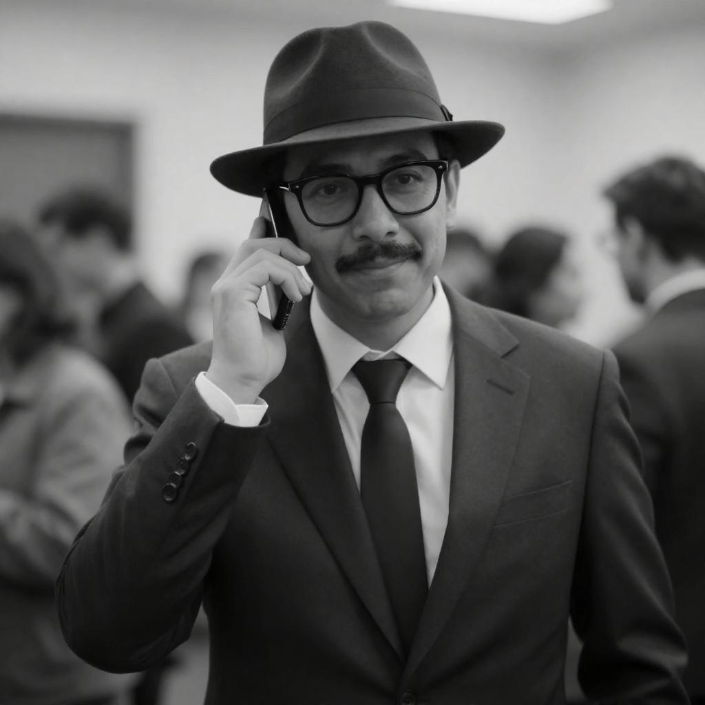 Black-and-white photo of a man with a mustache wearing a dark suit, white shirt, black tie, black-rimmed glasses, and a fedora hat. He is talking on a phone in a crowded indoor setting with blurred people in the background. The man has a confident expression.