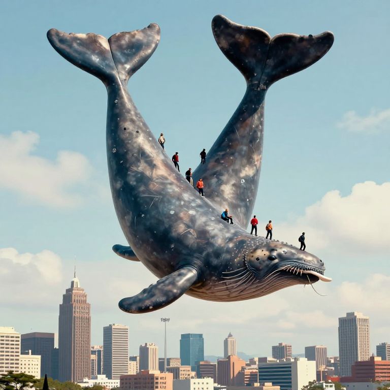 Photograph of a massive, metallic-gray, whale sculpture with detailed textures and realistic features, suspended in mid-air against a bright blue sky with scattered clouds. The whale has a large, curved dorsal fin and two prominent pectoral fins. Several people, wearing colorful clothes, stand on its back and tail, adding a sense of scale. Below, a cityscape with numerous skyscrapers in various shades of beige, gray, and brown is visible, suggesting an urban setting. The whale's realistic textures include visible skin folds and a large, expressive mouth with whiskers.