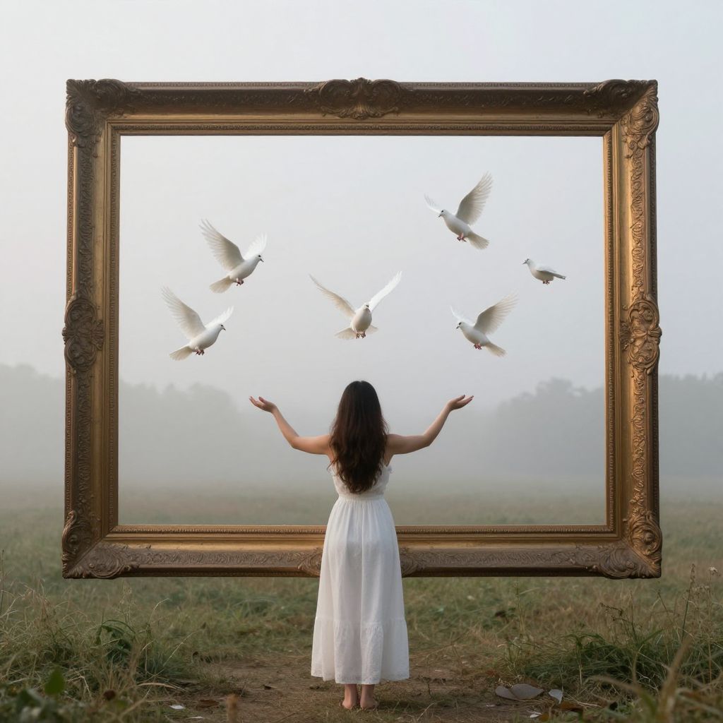 A woman stands before an enormous, ornate picture frame suspended in a misty field, her outstretched arms inviting white doves to pass seamlessly between the real world and the ethereal landscape within the frame, blurring the boundaries of reality and imagination.