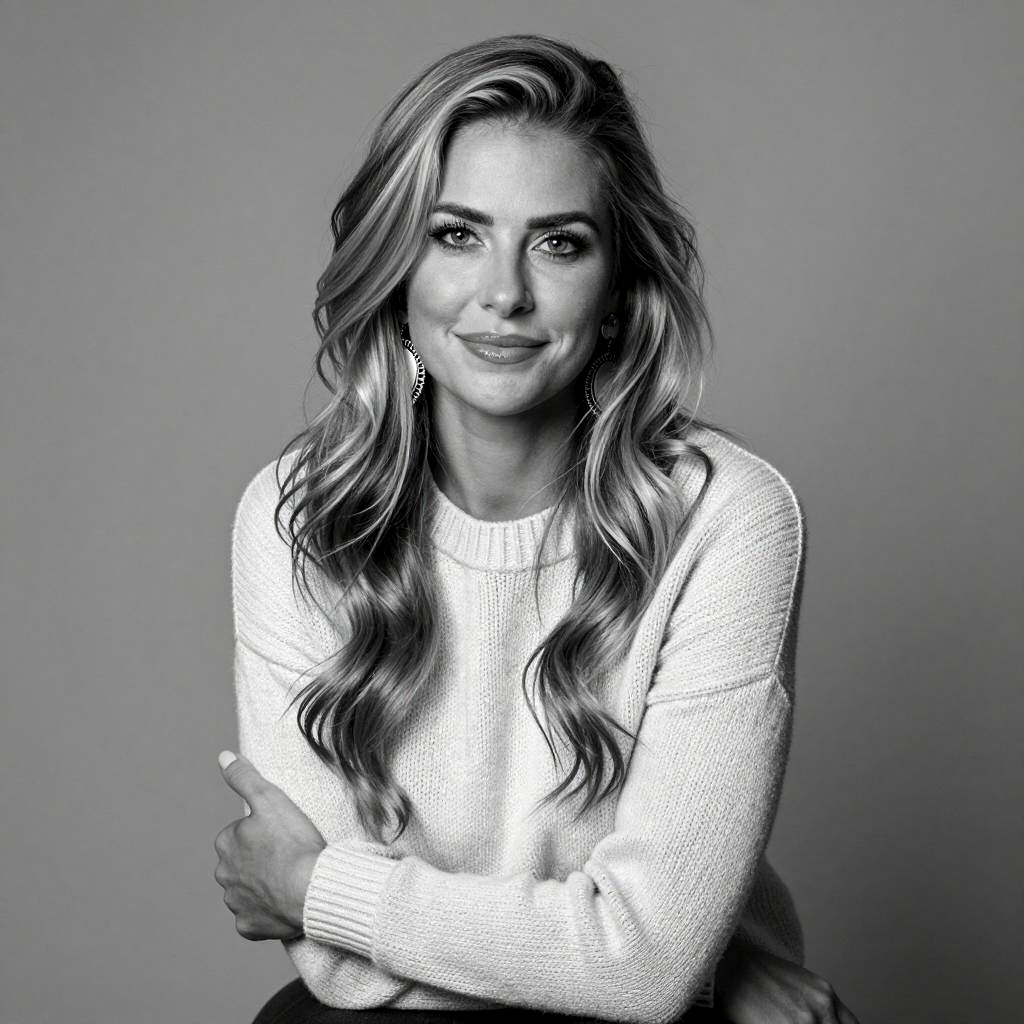 Woman with blonde hair, wearing a white floral sleeveless top and blue jeans, sitting on a yellow car, stretching her legs. She has a bright smile, her hands on her knees. Background: green grass, large concrete pillars, highway overpass. Sunlight illuminates the scene.