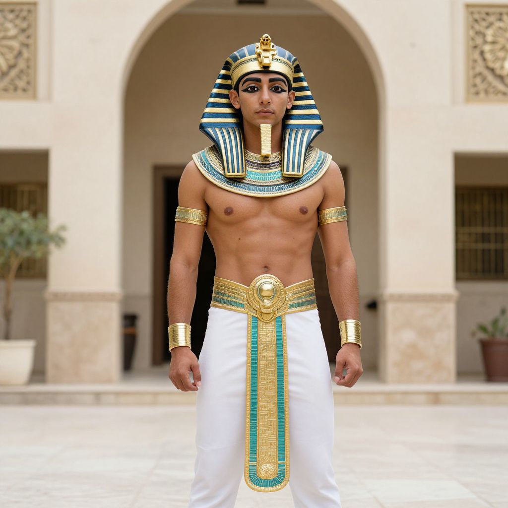 Photorealistic image of a muscular, dark-skinned male wearing ancient Egyptian pharaoh attire, including striped headdress, gold necklaces, and white