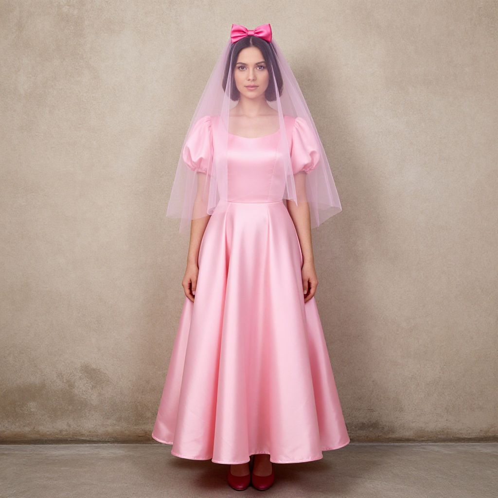 "Snow White Pink Dress, a woman in a pink dress and a veil standing in front of a wall"