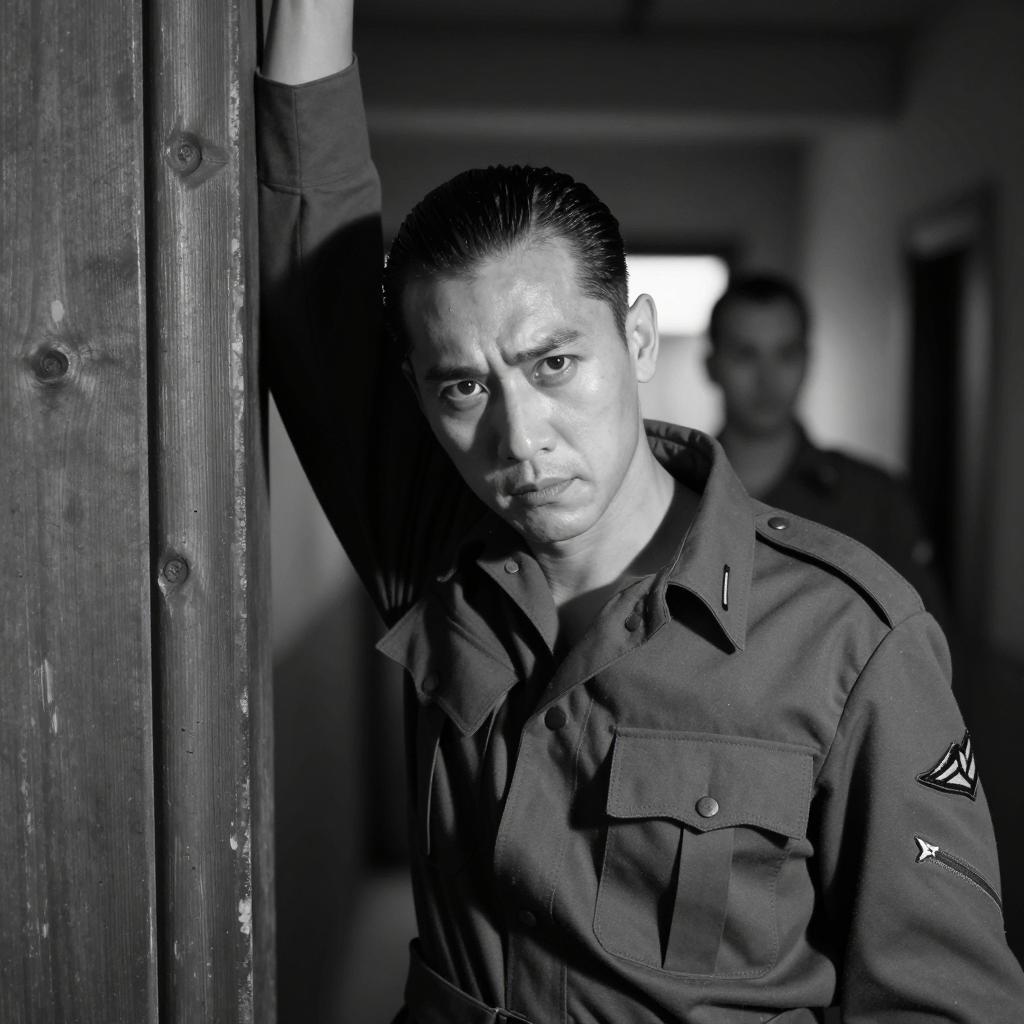 Black-and-white photograph of two male naval officers standing and facing each other. Both wear peaked caps and formal uniforms. Officer on left has hands on hips, looking at the other. Officer on right salutes. Bright background, shadows.