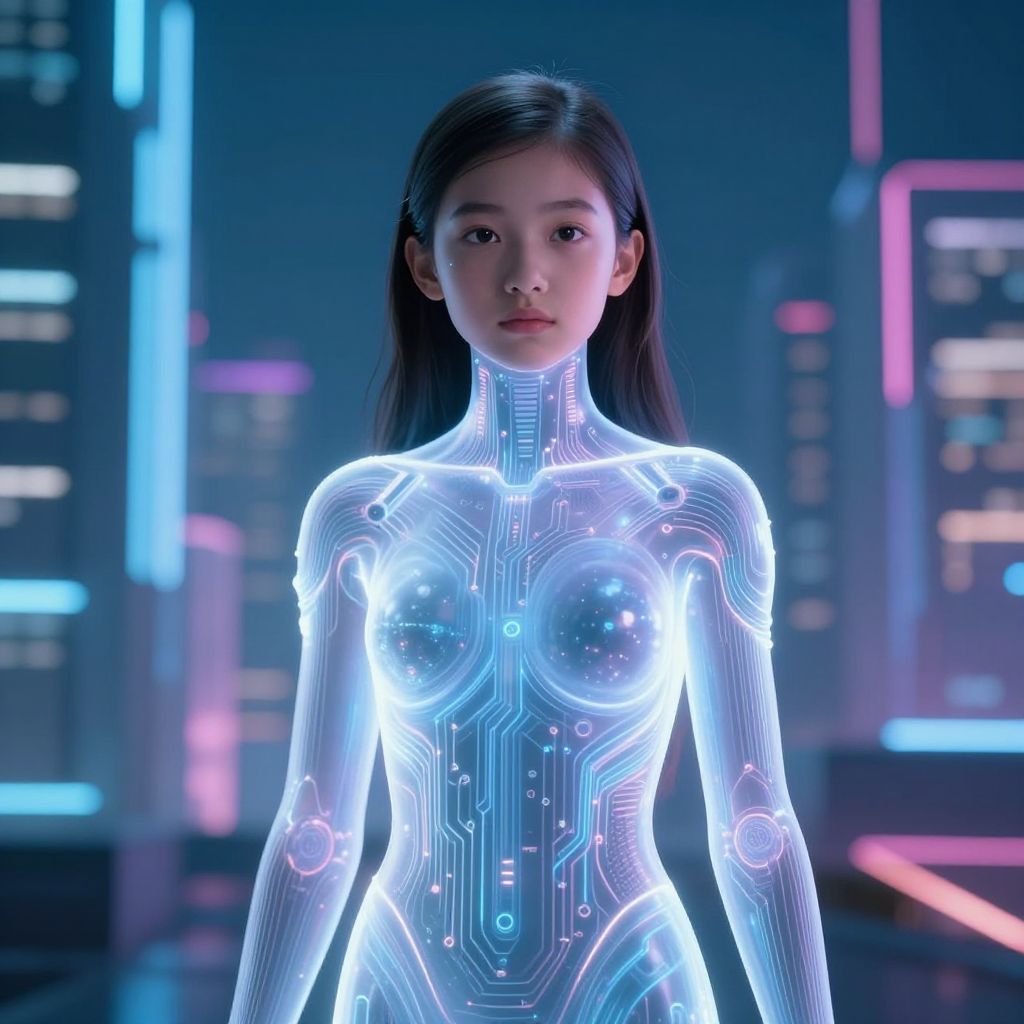CGI image of a glowing, cybernetic Asian woman with long black hair, neon-lit cityscape background, and futuristic, circuit-patterned