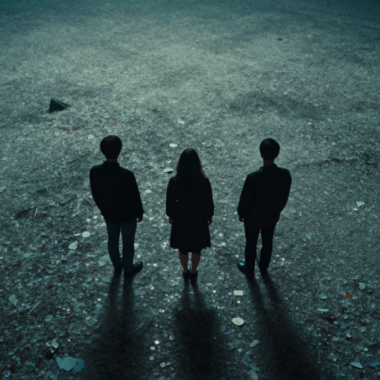 Suspended above the abyss of uncertainty, three figures stand amidst a sea of scattered dreams, their silent presence echoing the weight of unspoken desires and the haunting allure of untethered possibilities.