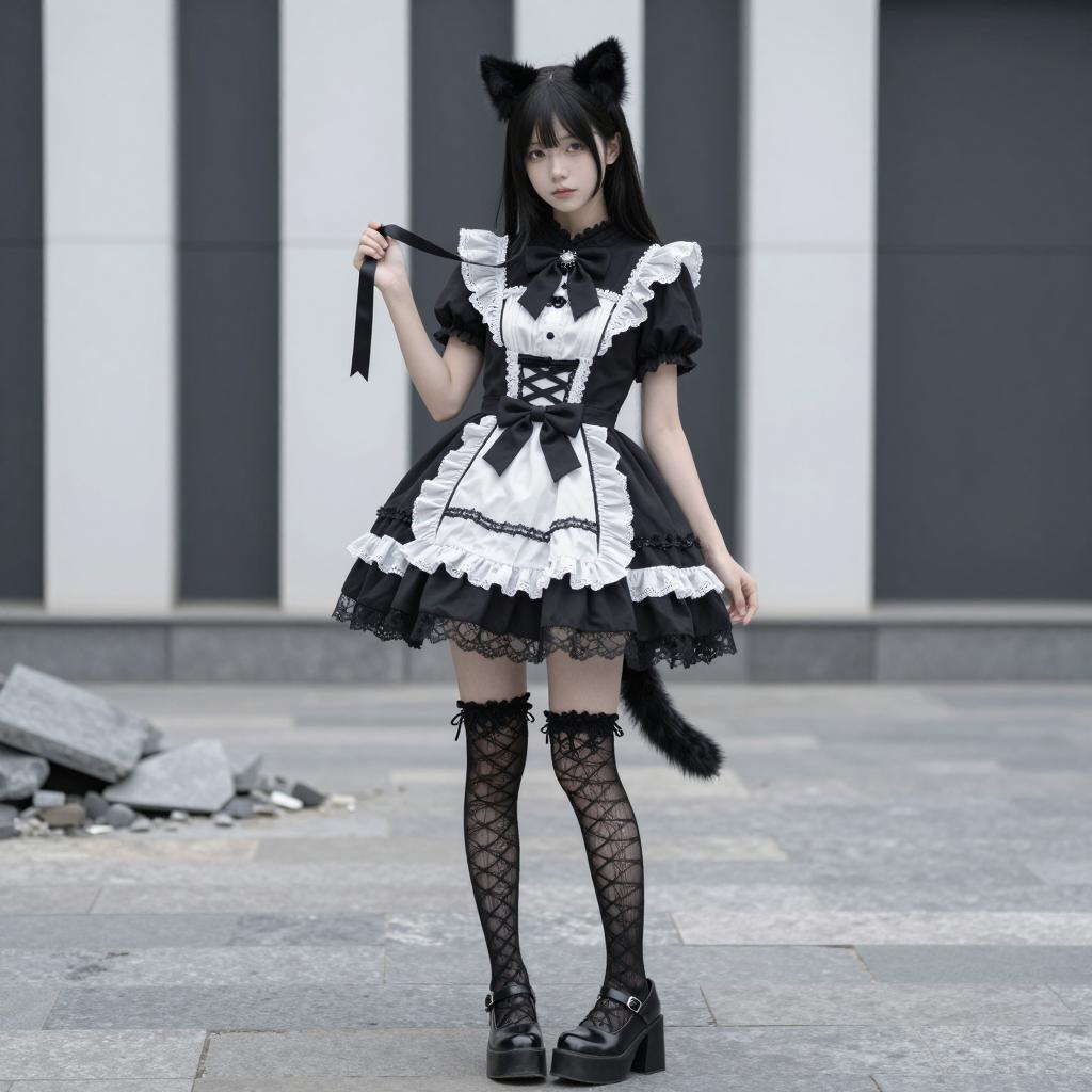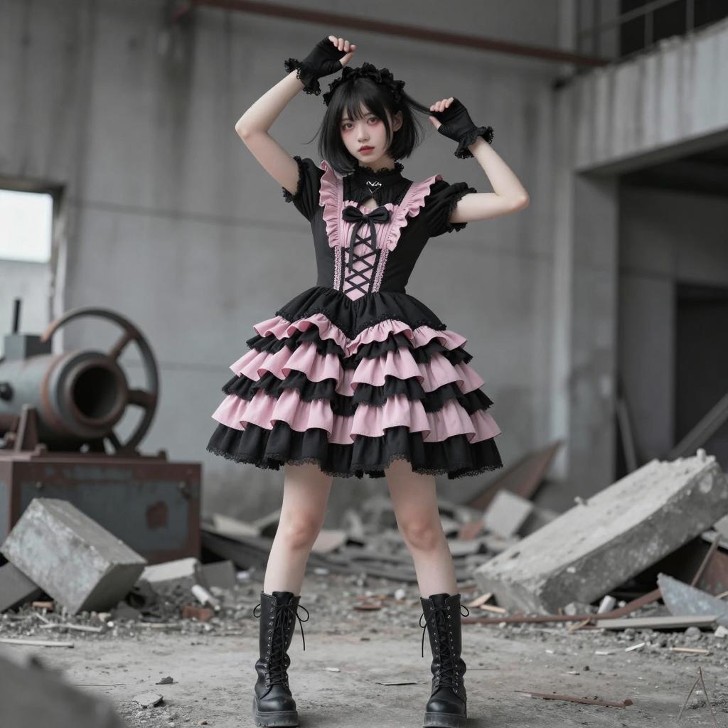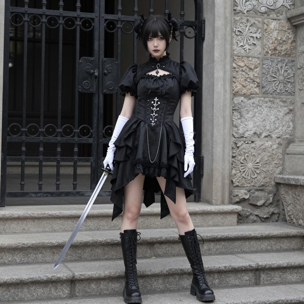 Asian woman with black hair in twin buns, standing on stone steps. Black gothic outfit with white gloves, lace-up boots. Holding katana in right hand. Ornate black wrought iron gate in background. Serious expression. Stone wall on right.