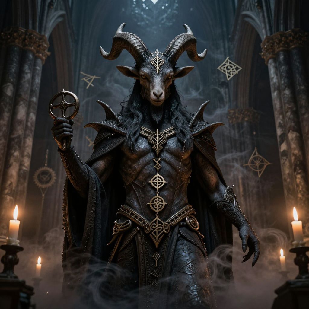 Bafomet depicted as a dark mystical figure with intricate horns and a blend of human and goat features, surrounded by ancient symbols and dark swirling mist, set in a gothic cathedral with candlelight illuminating shadows, highly detailed fantasy art style.