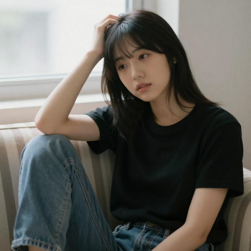 A dark, blue-tinted photograph of a young woman with fair skin and dark hair, wearing large blue headphones. She has a serious expression, with her right hand touching her chin. In the blurred background, another person with long hair is partially visible. The image has a moody, cinematic feel.