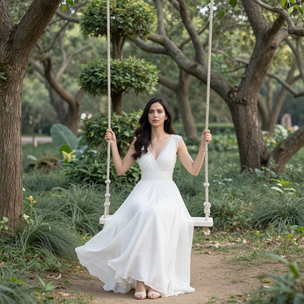 Photograph of a beautiful woman with long black hair, wearing a flowing white dress, sitting on a white swing in a lush, tree-filled garden.