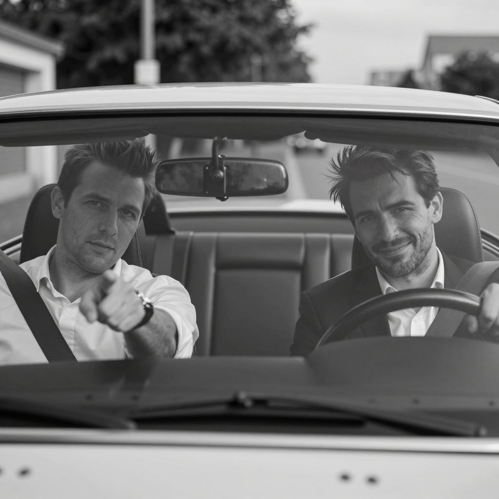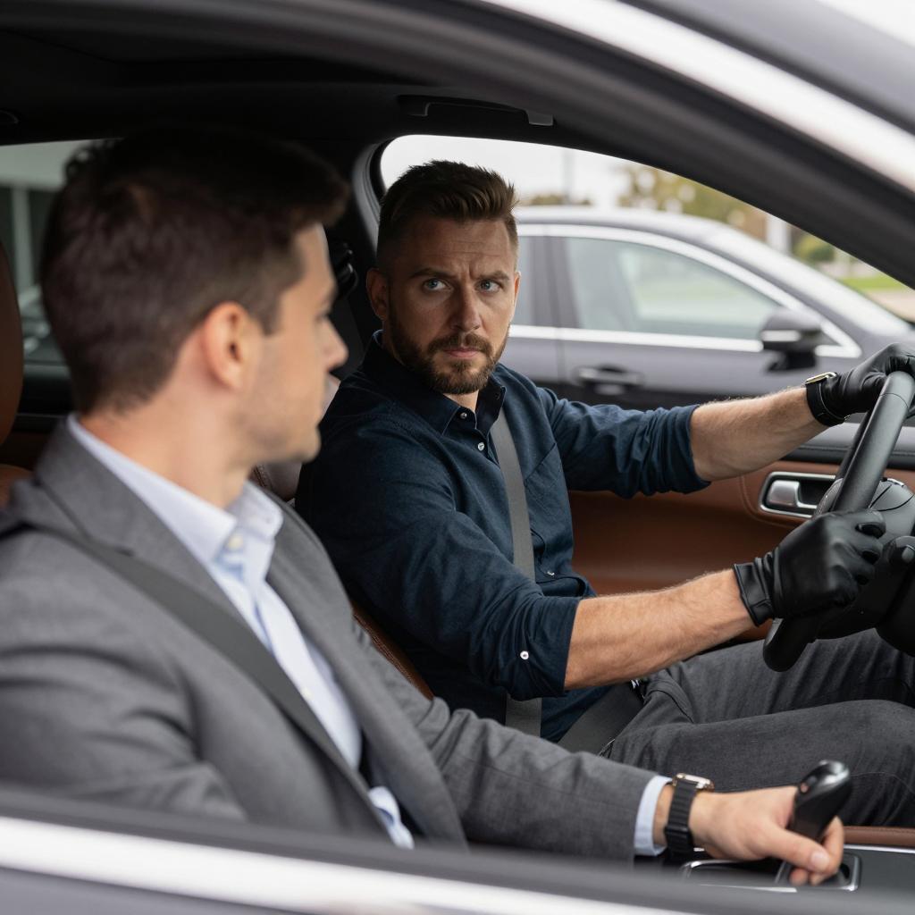 Man with short dark hair and light skin, wearing a beige jacket with brown sleeves, drives a black car at night. His intense gaze looks to the right. Car window and windshield wipers are visible. Dark background with a single red light in the distance.