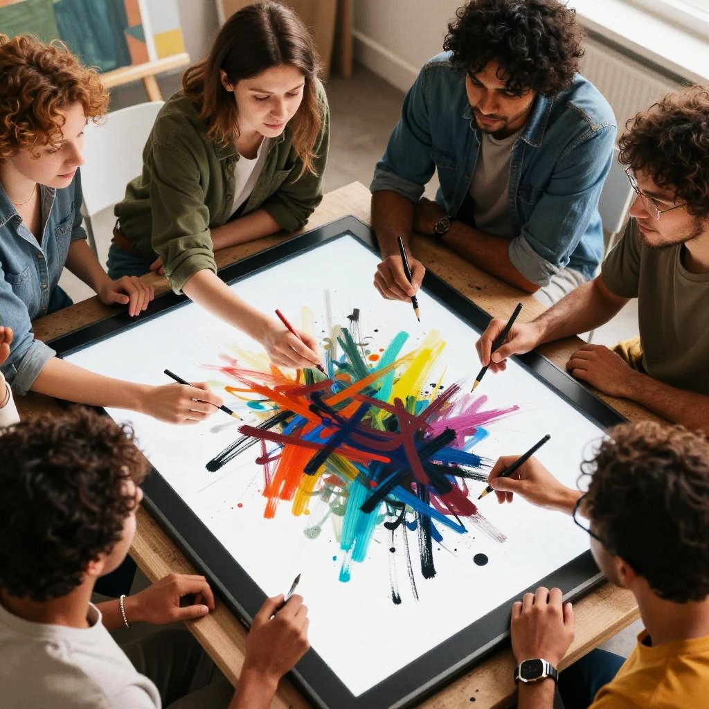 Digital art free scene portraying a diverse group of artists collaborating around a large digital tablet, their strokes blending seamlessly into a vibrant, dynamic composition representing collaboration and the open exchange of digital art ideas.