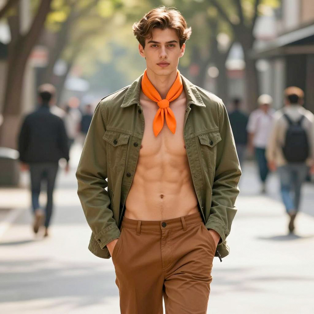 Fashion skinny man costume, photorealistic, fashion model, young man, shirtless, toned abs, brown hair, short hair, orange scarf, open olive green jacket, brown pants, street background, sunlight, trees, blurred pedestrians, confident expression, hands in pockets, daytime, casual style, summer, realistic lighting, urban setting, trendy, contemporary fashion