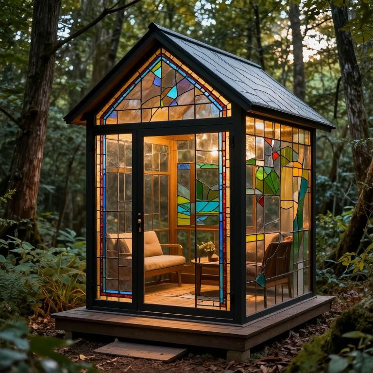 Photograph of a small, glass-enclosed, A-frame gazebo in a dense forest. The gazebo features colorful stained glass windows with geometric patterns in blue, green, red, and yellow. Inside, warm yellow light illuminates a cozy interior with a cream-colored armchair and a small table. The gazebo has a dark brown wooden frame and a gray shingled roof. The forest background is lush with tall trees and dense underbrush, creating a serene, natural setting. The gazebo is situated on a small wooden platform, surrounded by fallen leaves and forest vegetation.