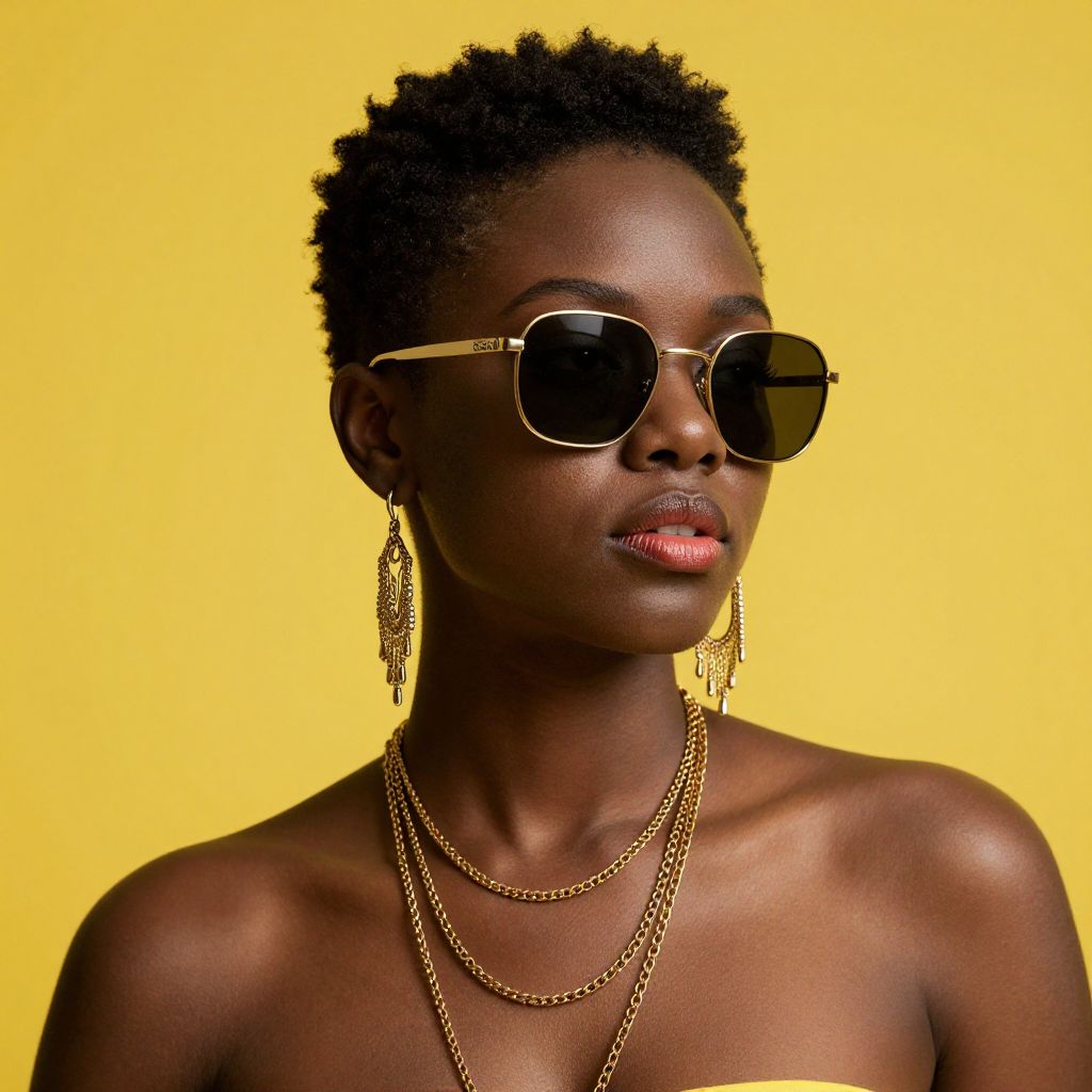 Photograph of a confident, dark-skinned woman with short, curly hair, wearing round sunglasses, gold chain necklaces, and dangling earrings against a