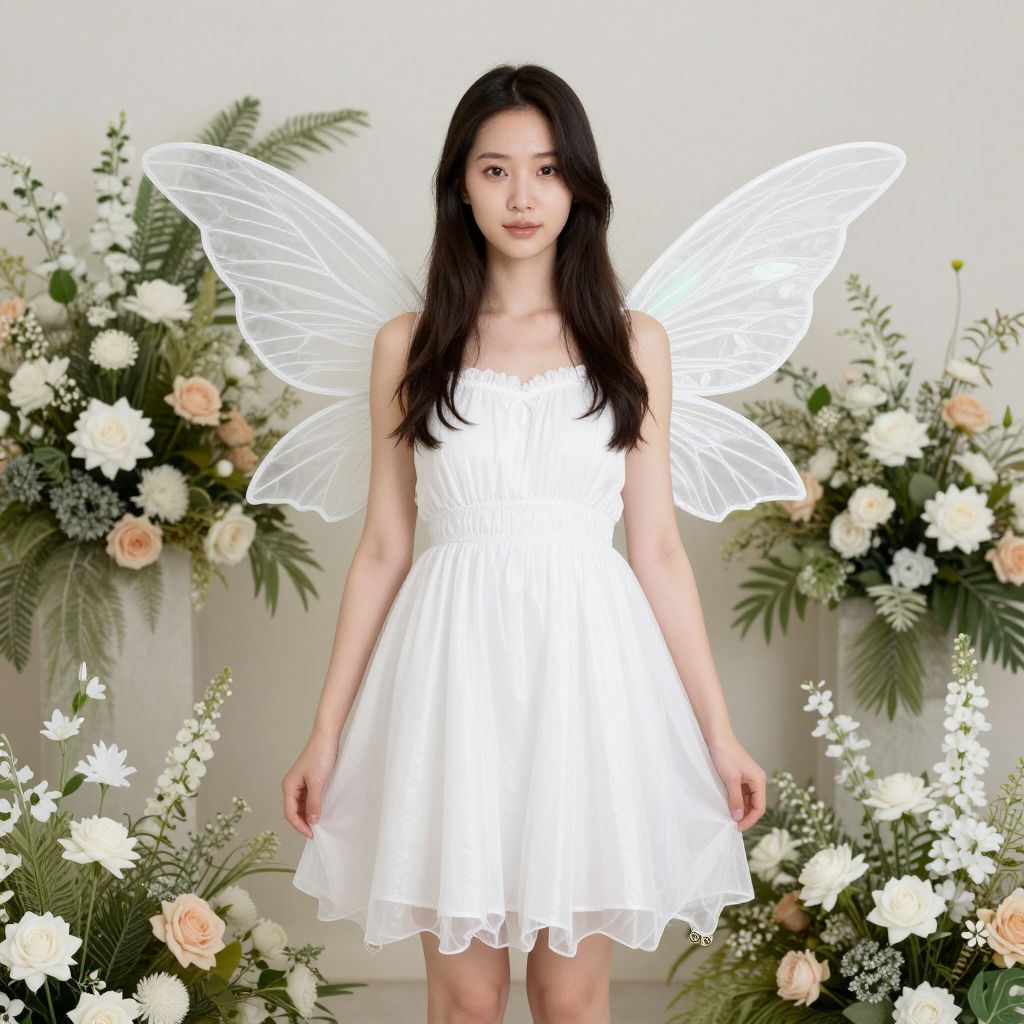 Photograph of an Asian woman with long black hair, wearing a white, sleeveless, knee-length dress and transparent fairy wings, standing in front of