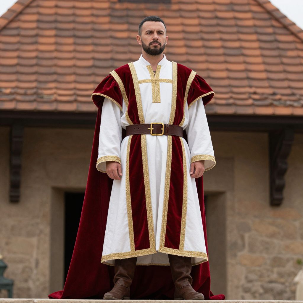 A photograph of a bearded man with a short, dark hairstyle, standing confidently in front of a stone building with a red-tiled roof. He wears a white, long-sleeved, medieval-style robe adorned with gold trim and a large cross on the chest, over a deep red velvet cape with gold edges. A brown belt with a gold buckle cinches his waist. He stands on a red carpet, with his hands resting by his sides. The background includes a stone wall and a small, dark-framed window. The overall scene has a historical, medieval European vibe.
