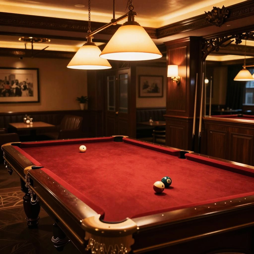 Red velvet pool table in a luxurious vintage billiard room, ornate wooden details, warm ambient lighting, plush red velvet felt, classic cues neatly arranged, art deco style