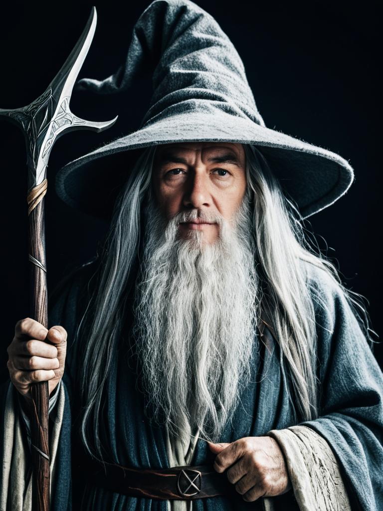 Man in Gandalf costume, photorealistic studio cosplay portrait, sharp tones