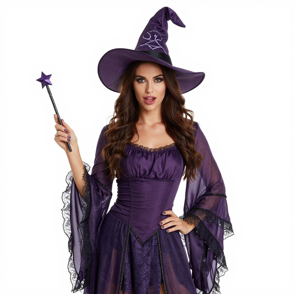 Mystic Witch Woman Adult Costume, woman in a purple hat and dress with a wand