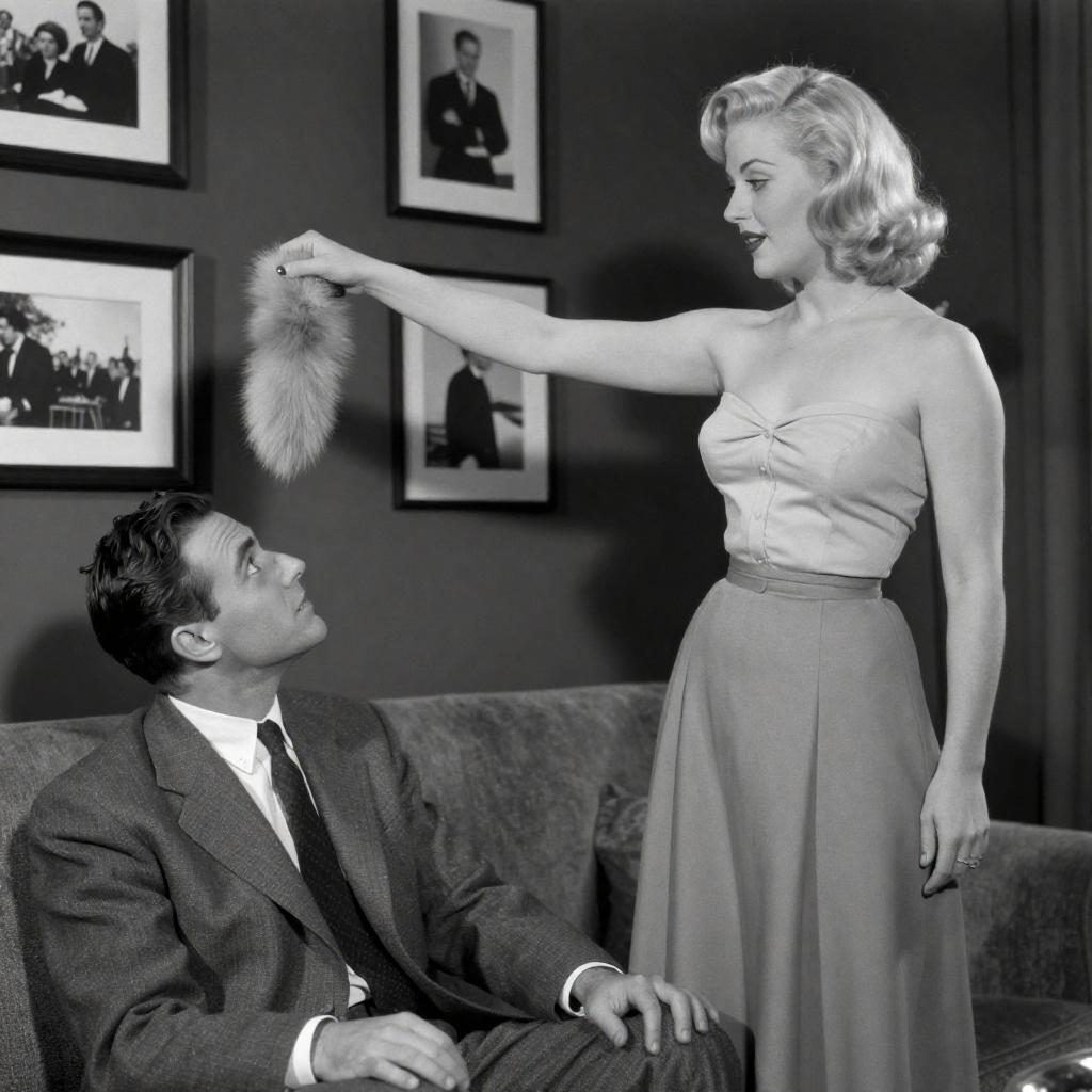 Black-and-white photograph of a 1940s-style scene. A blonde woman with a bob haircut, wearing a strapless top and high-waisted skirt, stands with her right arm extended, holding a fluffy dog's tail. A dark-haired man in a suit sits on a couch, looking up at her. The background features framed pictures on a dark wall.