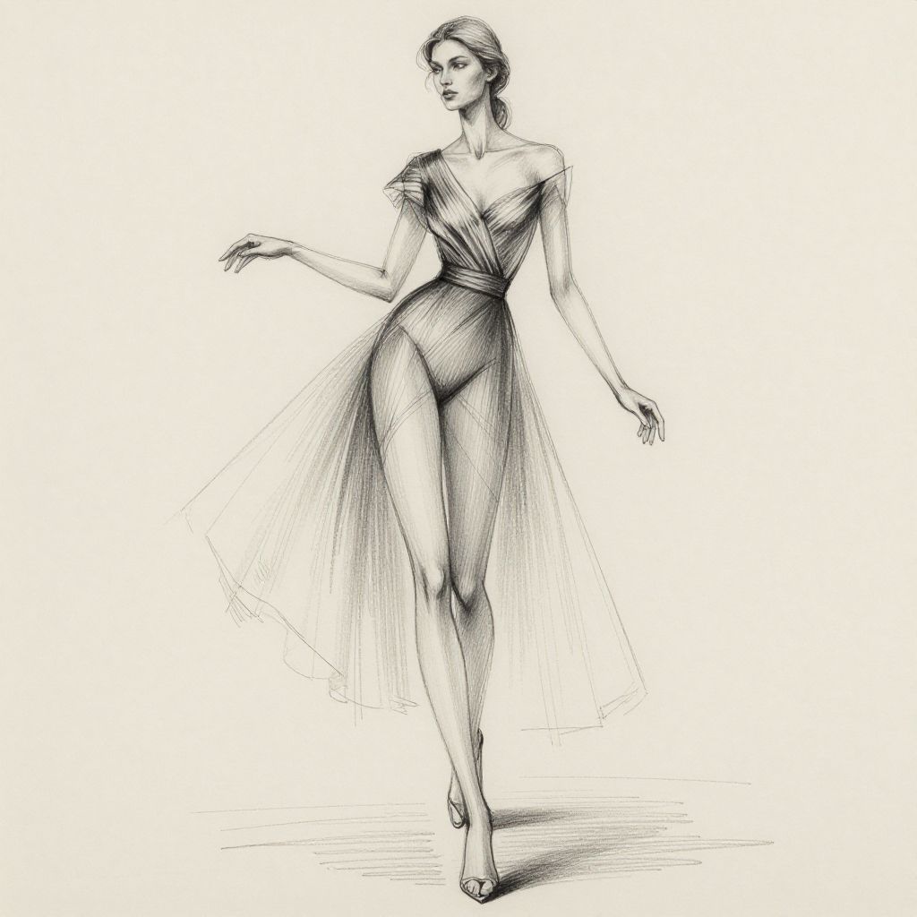 Fashion model sketch featuring elegant poses and flowing fabrics, detailed pencil strokes capturing dynamic motion, minimalistic backgrounds, high contrast shading, emphasizing slender silhouettes and haute couture style in a classic art studio setting.