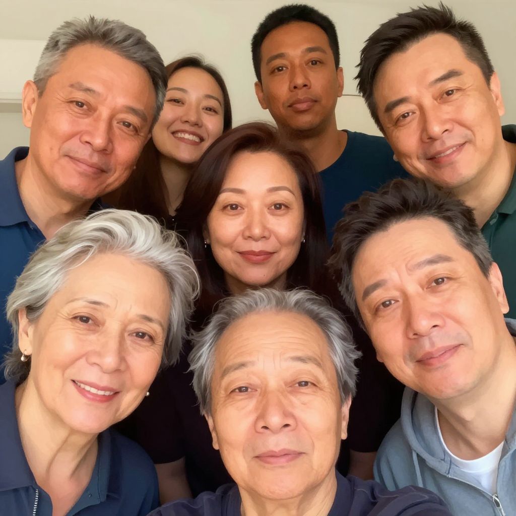 Group of diverse friends comparing selfies with old age filter online free applied, showing exaggerated wrinkles and gray hair, fun and casual setting, colorful and dynamic composition in a digital painting style.