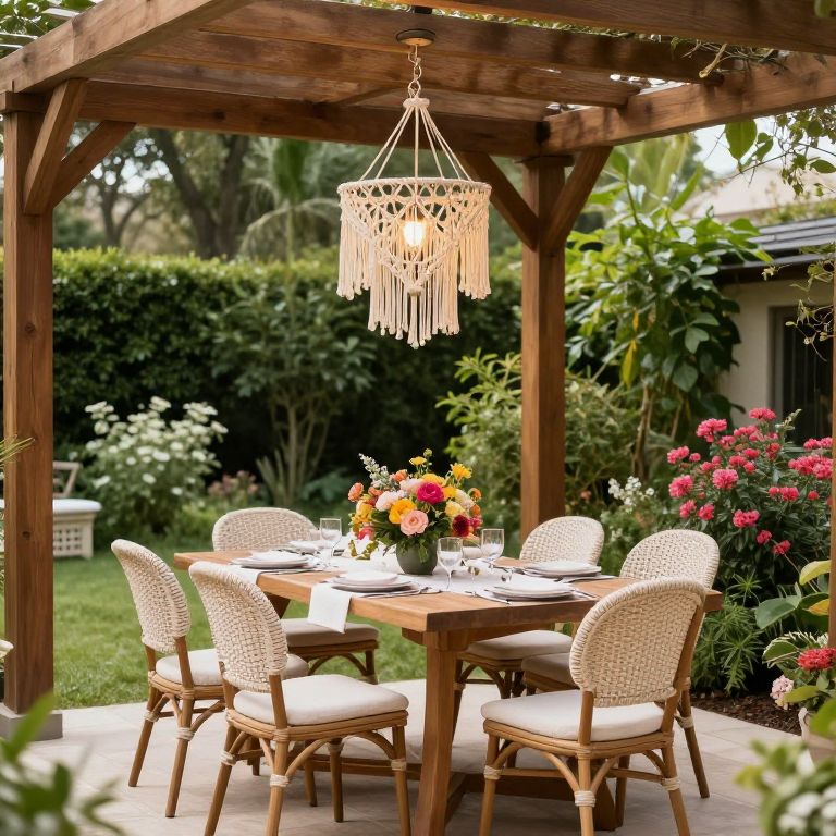 Outdoor dining area featuring a wooden pergola with a hanging macrame chandelier above a rectangular table set for six, adorned with a vibrant floral centerpiece and surrounded by lush greenery and blooming shrubs.