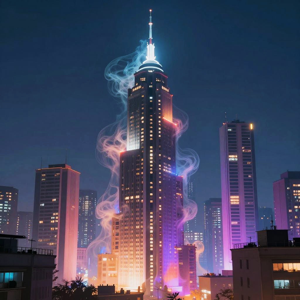 Diffusion architecture, an ethereal urban environment where buildings dissolve and reform through gaseous diffusion, vibrant neon colors, cyberpunk aesthetics