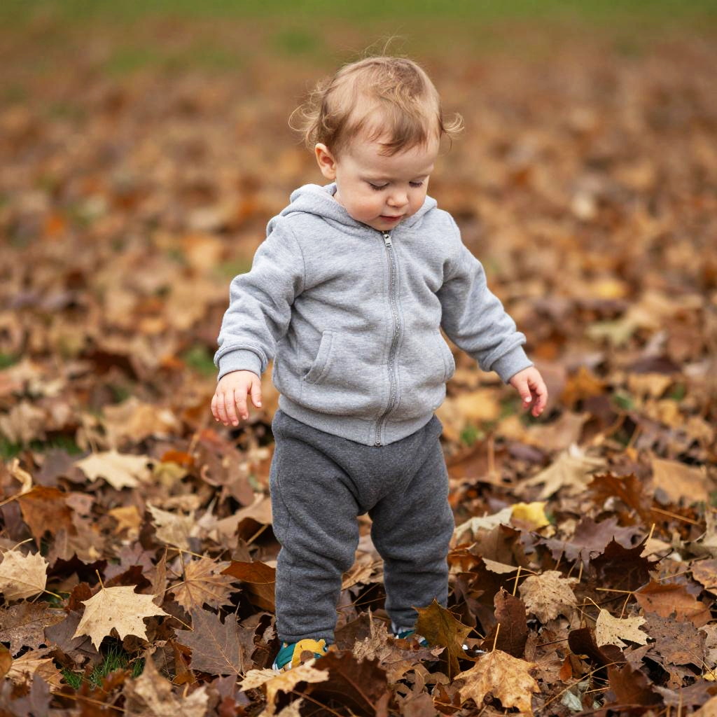 A young toddler with light brown hair wearing a gray zip-up hoodie and dark gray pants stands amidst a pile of dry autumn leaves. The setting suggests a park or backyard during fall with brown and yellow leaves scattered around the child.