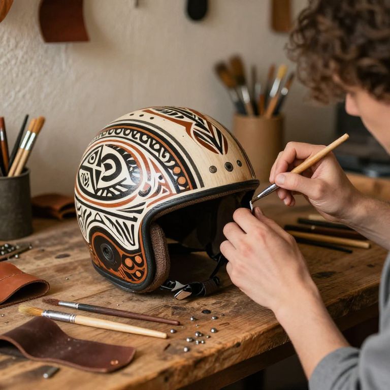 Make your own helmet workshop, cozy rustic studio with wooden workbench scattered with leather, metal rivets, and paint brushes, artisan hand-painting unique tribal patterns on the helmet, warm natural lighting and textured background, hyper-detailed rustic aesthetics.