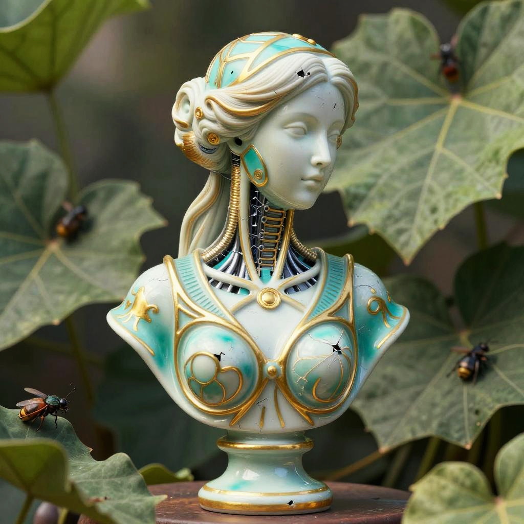 Photograph of a white porcelain bust of a woman with intricate gold and turquoise details, including ornate shoulder armor and mechanical elements on her neck. Her hair is styled in an elegant updo with gold accents. The background features large green leaves with visible veins and small black berries. The bust is centered, with leaves partially framing it. The image has a soft focus, highlighting the detailed craftsmanship of the bust against the natural, slightly blurred foliage.