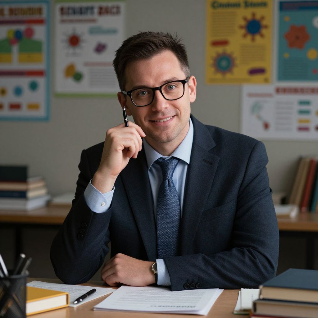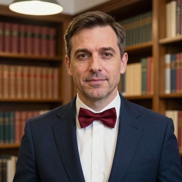 Photograph of a middle-aged Caucasian man with short, neatly combed dark brown hair and light stubble, wearing a dark navy blue suit with a white dress shirt and a maroon bow tie. He has a slight smile and is standing in front of a wooden bookshelf filled with various books, some with red and green spines. A circular ceiling light is visible in the upper left background. The man's expression is confident and professional, and the setting suggests a library or study. The image has a clear, sharp focus and well-balanced lighting.