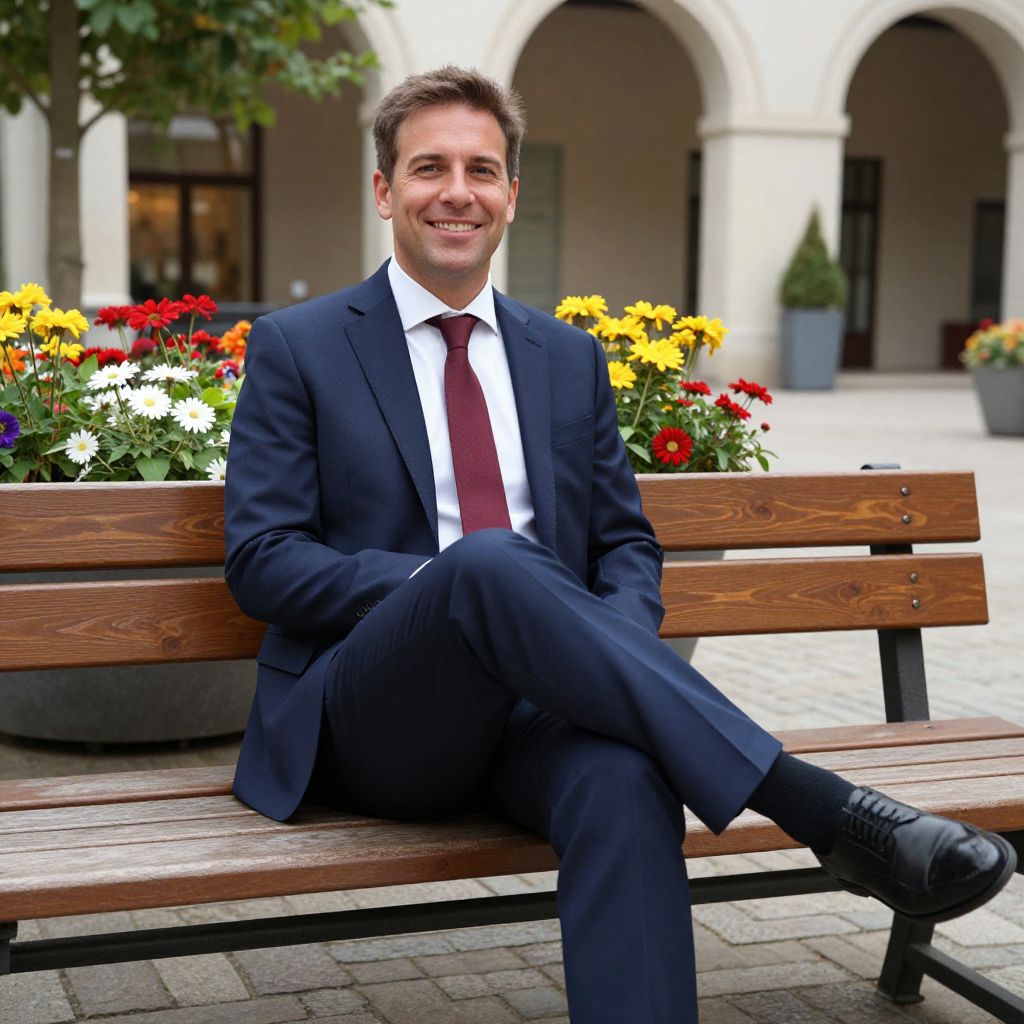 Photograph of a middle-aged man with short brown hair, light skin, wearing a dark navy suit, white shirt, and maroon bow tie,