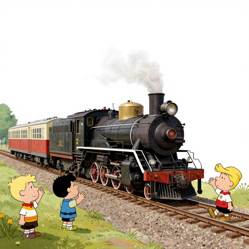 Photo Manipulation style of Charles M. Schulz, Railroad with steam locomotive on the railroad line, with tracks. Driving through a landscape. With children waving. white background, detailed,