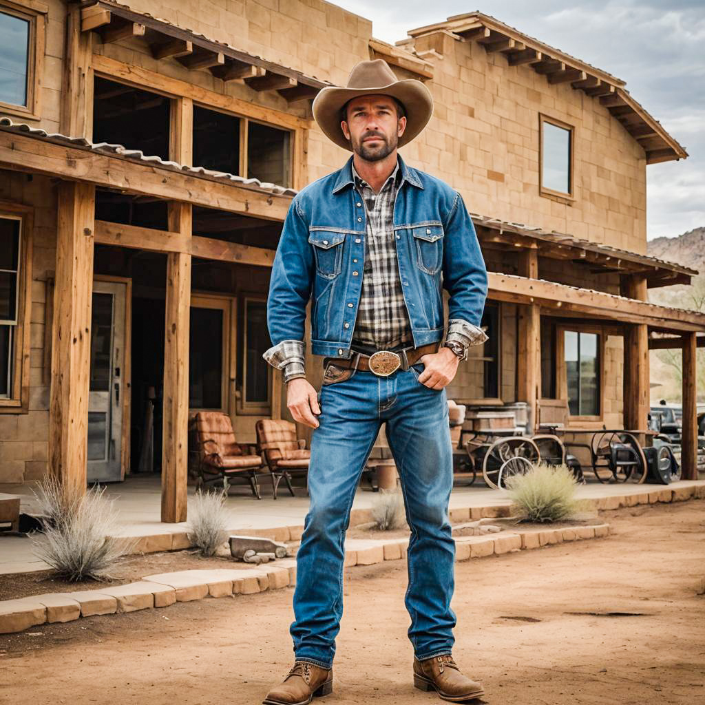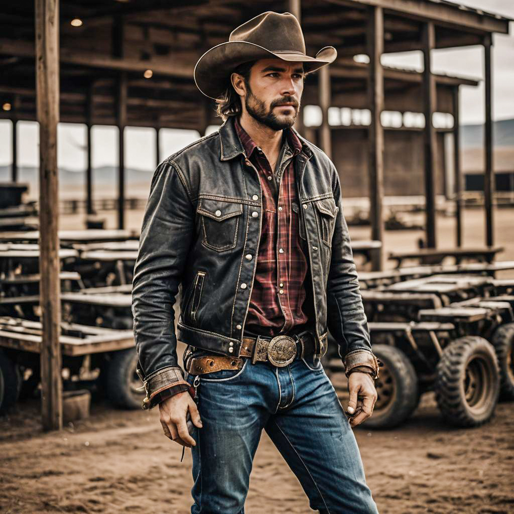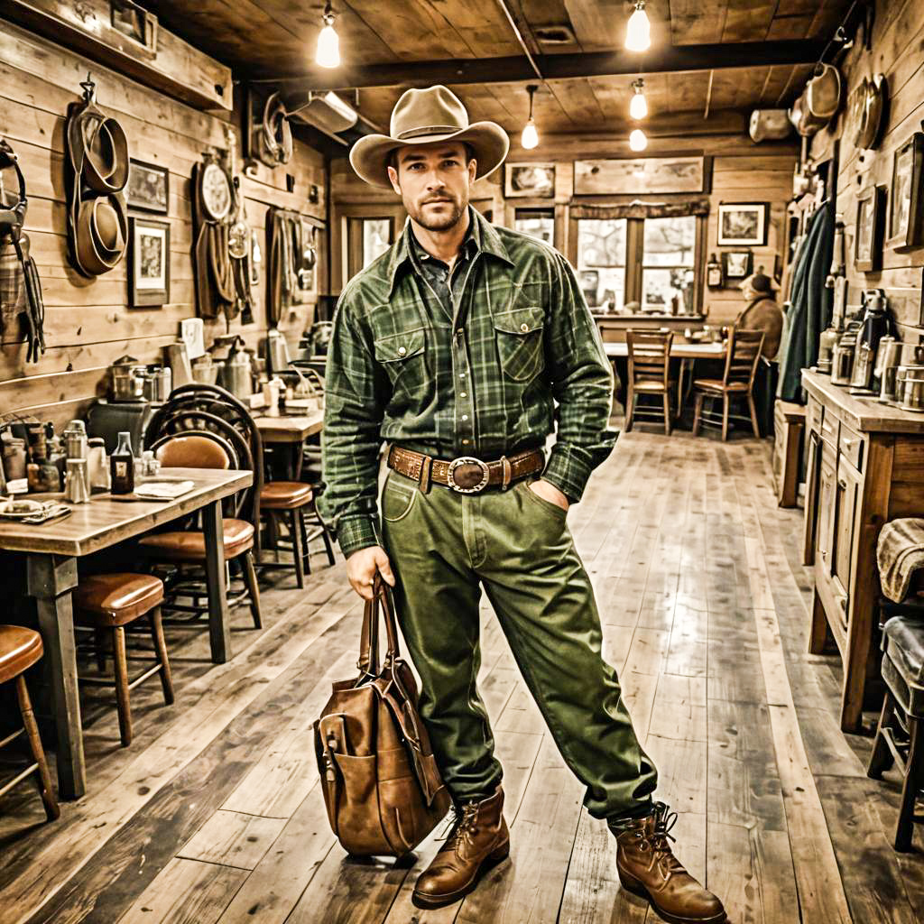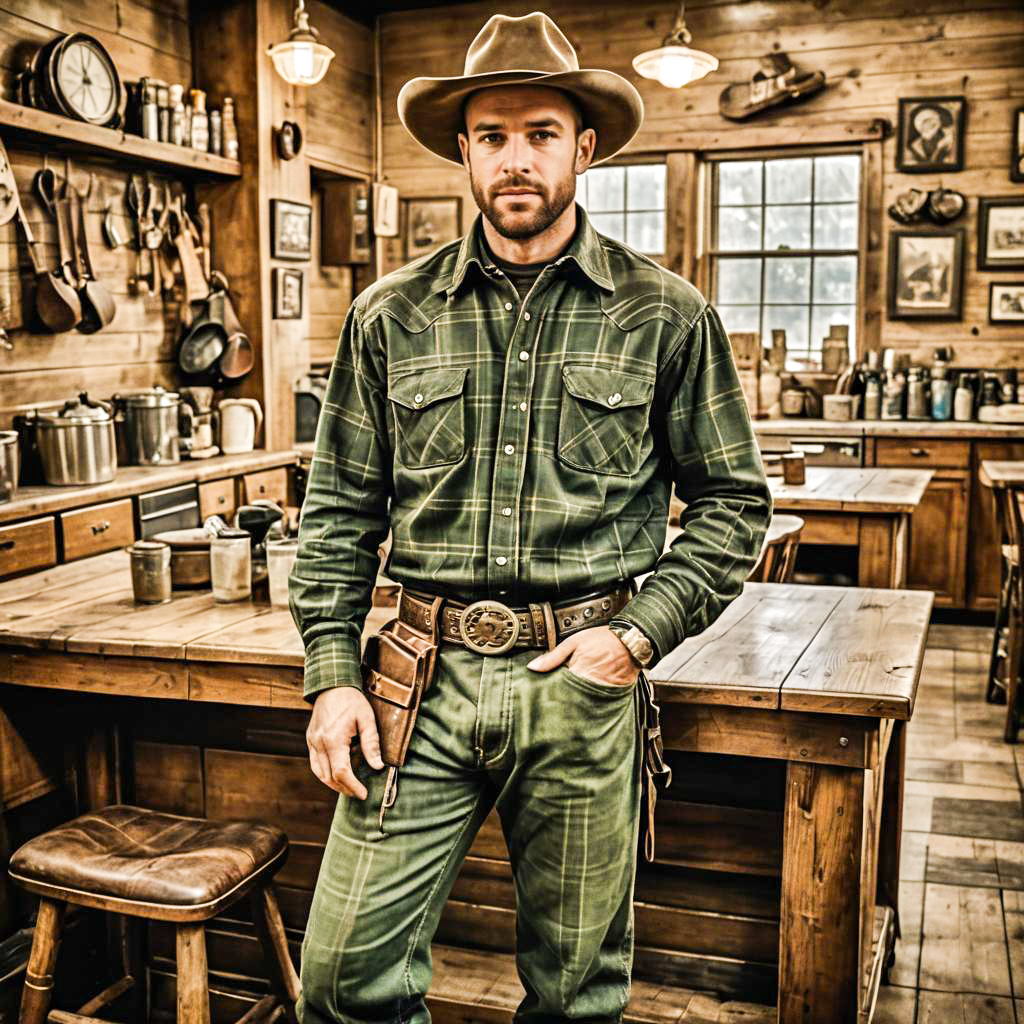 Photo of a Rugged Build man, Buzz Cut, cowboy outfit, cowboy hat, leather boots, joggers, plaid shirt, leather belt with buckle, western style, Olive Green, Wool-silk blend, Diner Scene, artistic filter