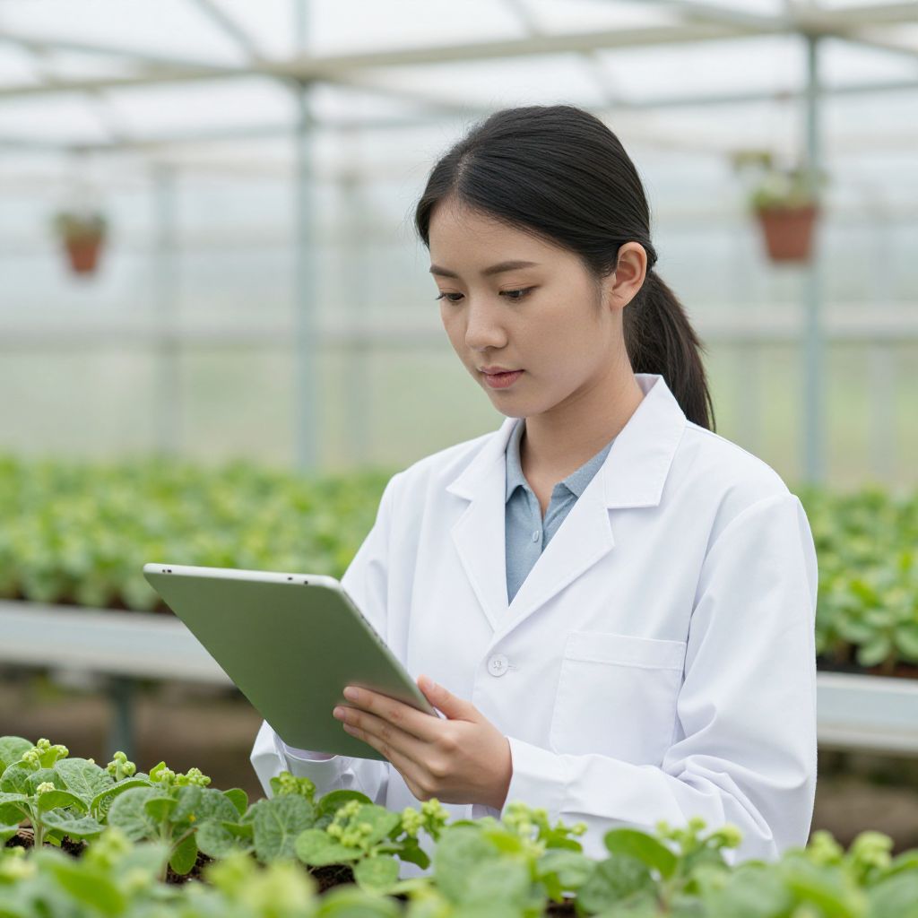 Photograph of an Asian woman in a white lab coat, black hair in a ponytail, holding a tablet, standing in a greenhouse, examining green