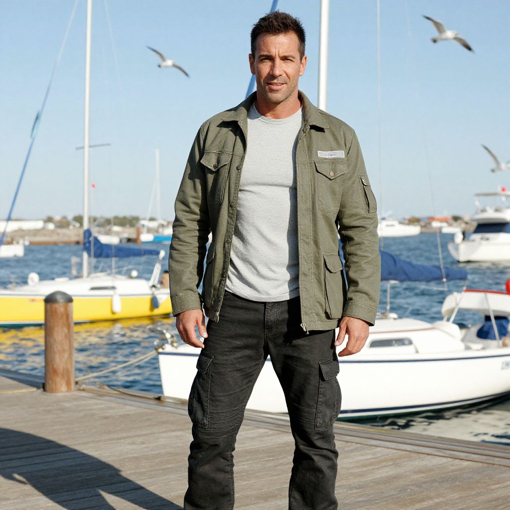 A man, olive green utility jacket, fitted gray t-shirt, tapered black cargo pants, rugged canvas material, sun-drenched docks, colorful sailboats bobbing, seagulls soaring overhead, 3M analog film stock, relaxed smile, confident demeanor. Man has masculine face and piercing eyes