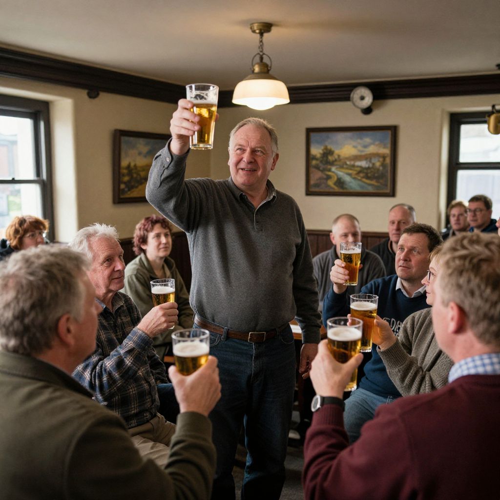 In a rustic Irish pub, a man raises a glass of beer in a toast, surrounded by a lively crowd of patrons, all holding their own glasses, in a scene reminiscent of Norman Rockwell's art.