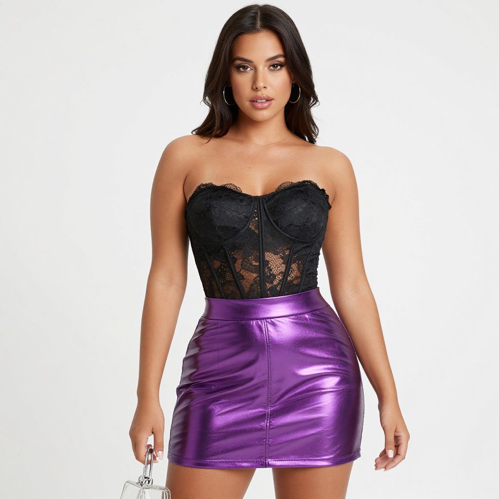 "Woman, modern party look, black lace strapless bustier top, sweetheart neckline, high-waisted metallic purple skater skirt, glossy finish, clear acrylic clutch, white background.. Sexy. Pretty face and beаutiful eyes. Big breasts."