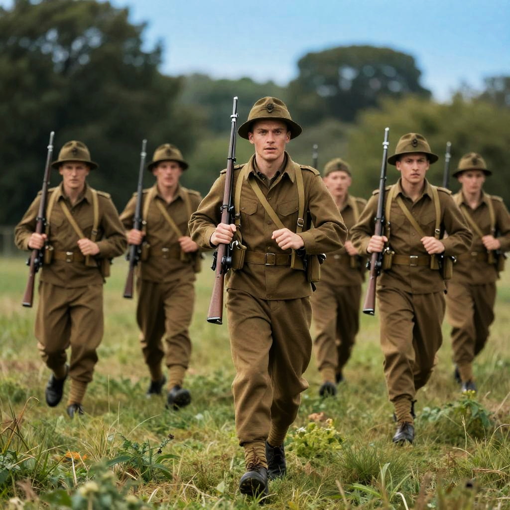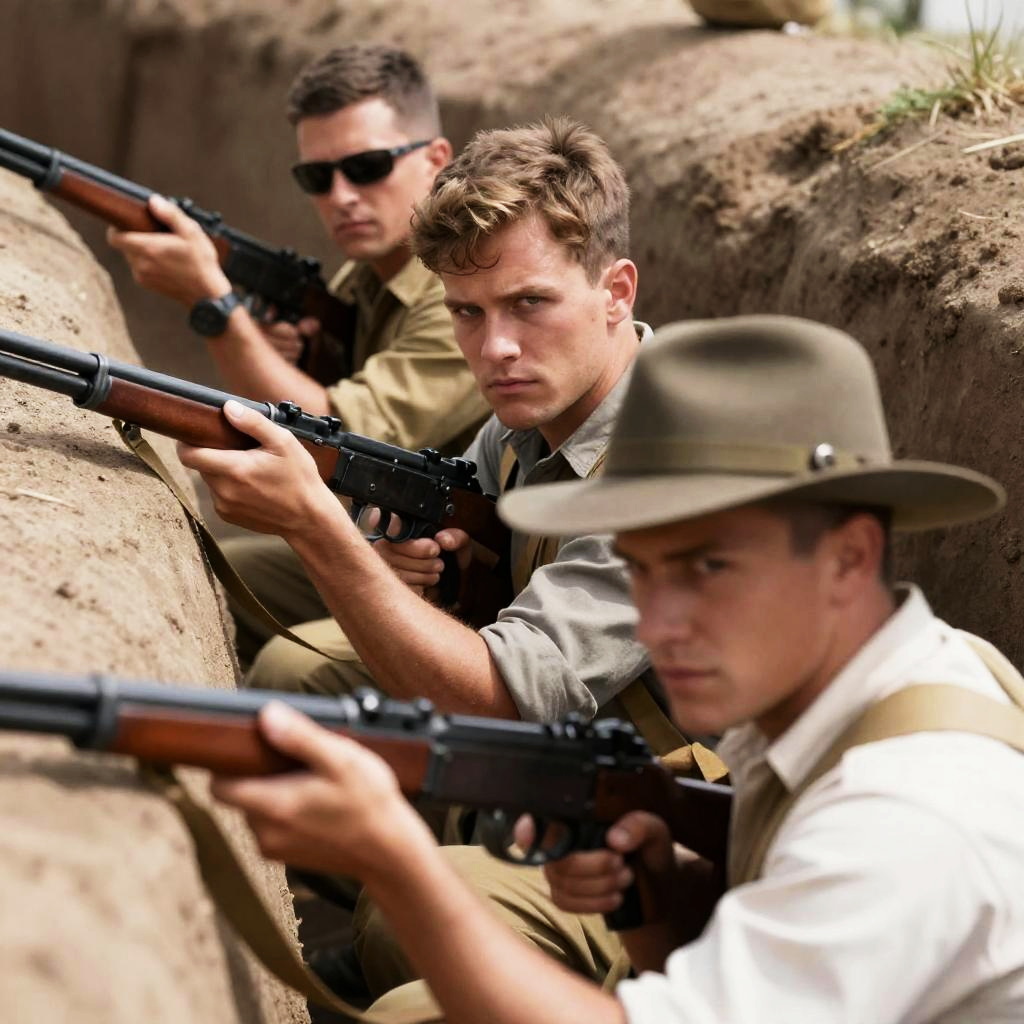 Photograph of three soldiers in a trench. Foreground soldier with blonde hair, intense expression, wearing a wide-brimmed hat, white shirt. Middle soldier with brown hair, serious expression, grey shirt. Background soldier with sunglasses, rifle, partially visible. All holding rifles, leaning against dirt wall. Sunlight illuminates faces and trench.
