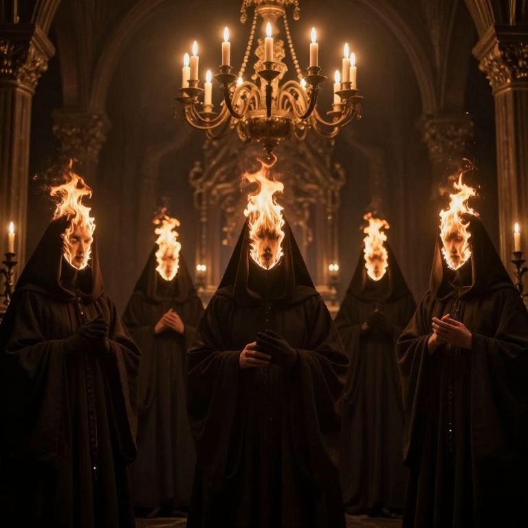 Photograph of six robed figures in a dimly lit, Gothic-style cathedral. Each figure wears a black hooded garment, with their faces entirely engulfed in bright, fiery flames, creating an eerie glow. They stand in a semi-circle, centered under a large, ornate chandelier with lit candles. The background features arched ceilings and more chandeliers, enhancing the dramatic, mystical atmosphere. The dark robes contrast sharply with the intense, warm flames, creating a striking visual effect. The scene evokes a sense of ritual or supernatural presence.