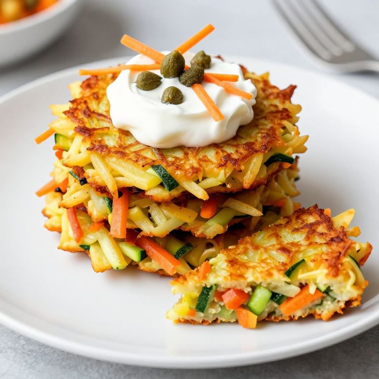 Golden veggie-packed latkes, crafted with shredded potatoes, carrots, zucchini, and bell peppers, are artfully stacked on a white plate, topped with a dollop of creamy sour cream, vibrant green capers, and garnished with a few scattered carrot shreds, while a slice reveals their fluffy interior and colorful filling.