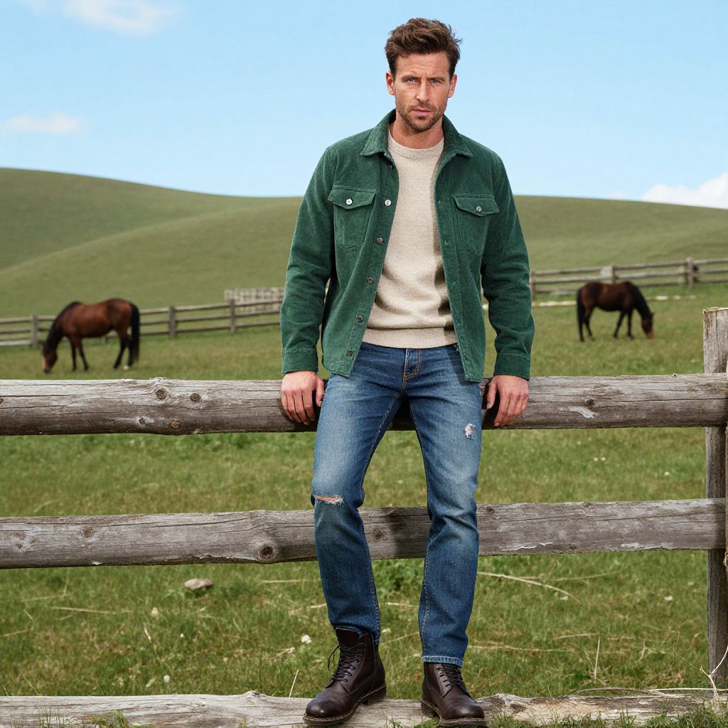 A man, forest green corduroy jacket, beige crew neck sweater, distressed slim jeans, dark brown lace-up boots, rolling green hills, rustic wooden fences, grazing horses under a bright blue sky, Cibachrome style, relaxed expression.Man has masculine face and piercing eyes