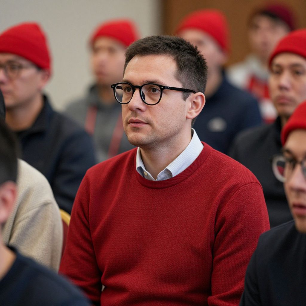 A man in a red sweater and glasses is sitting in a crowded room, with other people wearing red hats in the background.