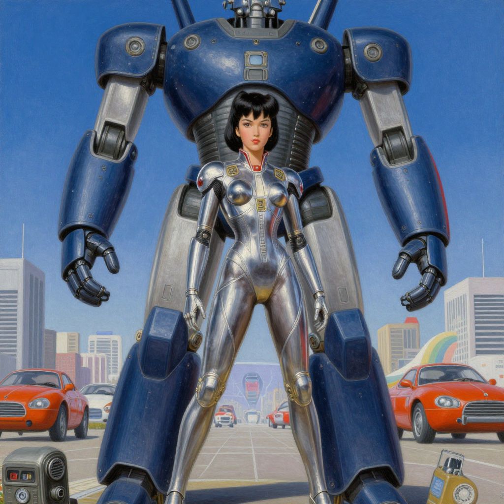A futuristic, high-detailed painting by James Jean and Todd Schorr depicts a woman in a metallic suit standing in front of a giant robot, with a cityscape and futuristic vehicles in the background, inspired by retro futurism and classic Japanese superheroes.