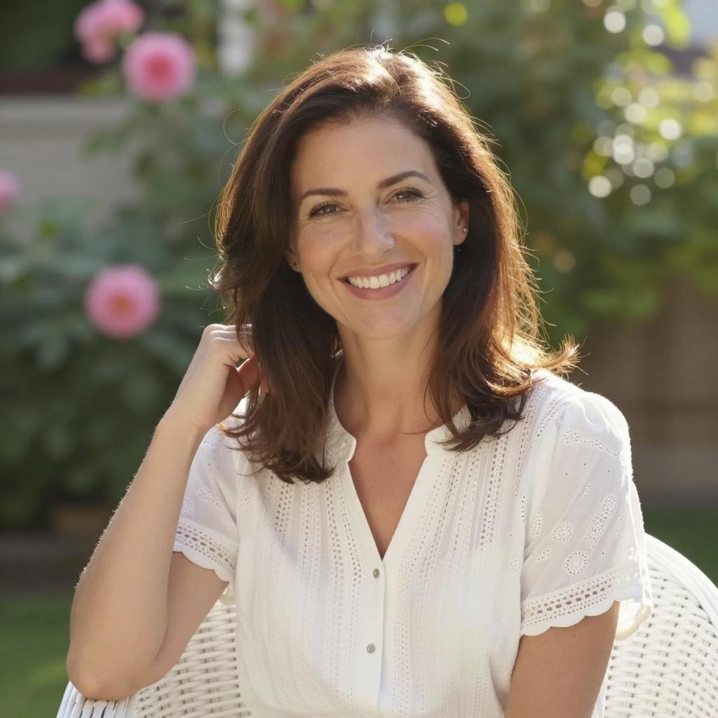 Woman with fair skin, brown wavy hair, wearing a light blue shirt, smiling slightly, looking to the right. Blurred kitchen background with wooden cabinets, a table, and a chair. Warm lighting. Close-up, head and shoulders.