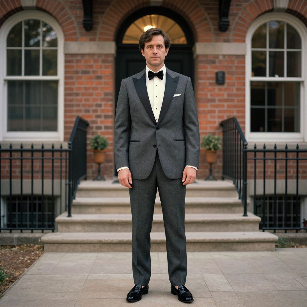 Photograph of a handsome man with light skin and brown hair, wearing a grey tuxedo with black bow tie, standing on steps in front of