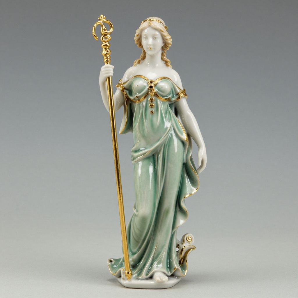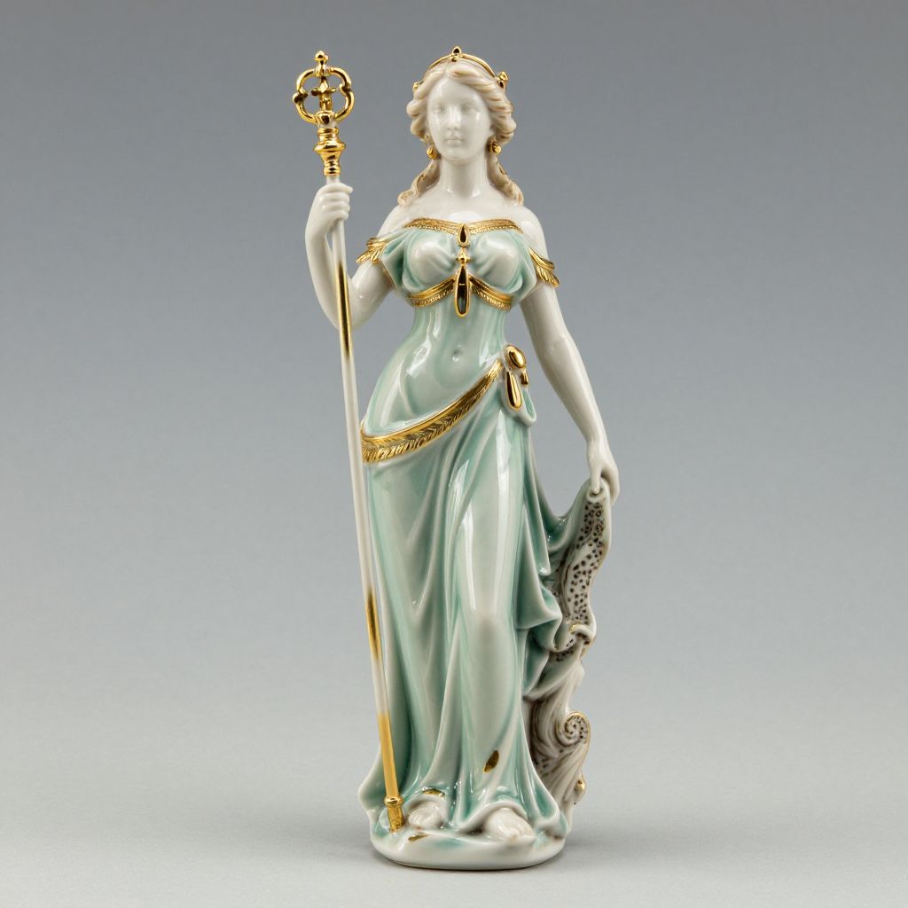 Photograph of a white porcelain statue of a regal woman in a mint green gown, holding a gold staff and draped fabric, with ornate gold